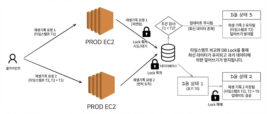 조회 → 비교 → 저장 사이에 다른 요청이 끼어들며 최신 값이 다시 덮어씌워질 수 있는 상황이었습니다.