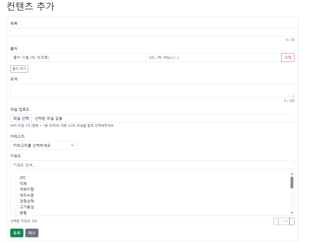 Whisper API 결과물이 생각보다 부정확했다. 그래서 3번에서 결국 직접 오디오를 들으면서 대본을 고쳐야 했다. 제목이나 요약, 키워드도 AI가 뽑아줄 순 있는데, 그대로 쓰기엔 어색해서 사람이 한 번은 봐야 했다.