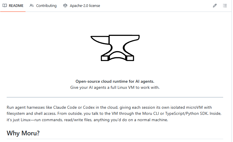 해커톤 주최 측에서 제공한 스타터 레포에는 Moru라는 오픈소스 클라우드 런타임이 연동되어 있었다. Moru는 AI 에이전트에게 완전한 리눅스 VM을 제공해주는 서비스다. 각 에이전트 세션마다 격리된 microVM(Firecracker 기반)을 만들어주고, 그 안에서 파일 읽기/쓰기, 셸 명령 실행 등 일반 리눅스 머신에서 할 수 있는 모든 걸 할 수 있다.