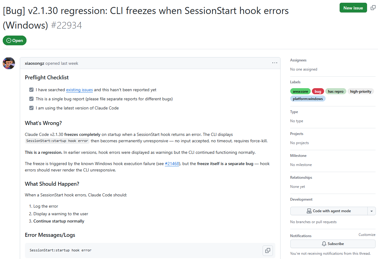 이 이슈는 좀 더 깊이 파고든 분석이 담겨 있다. 제목부터 직관적이다: "[Bug] v2.1.30 regression: CLI freezes when SessionStart hook errors (Windows)"