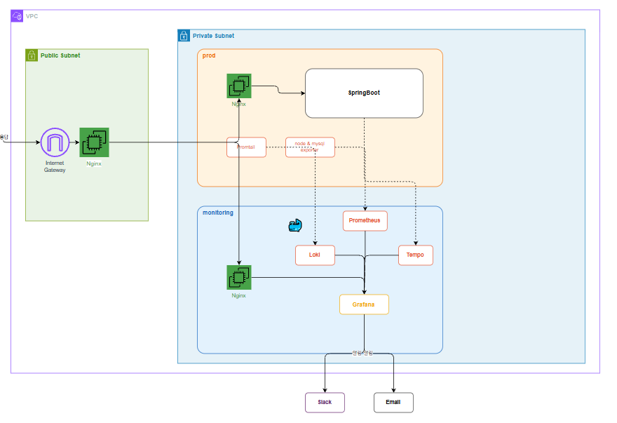 - 데이터 흐름 화살표는 실선, 메트릭/로그 수집은 점선