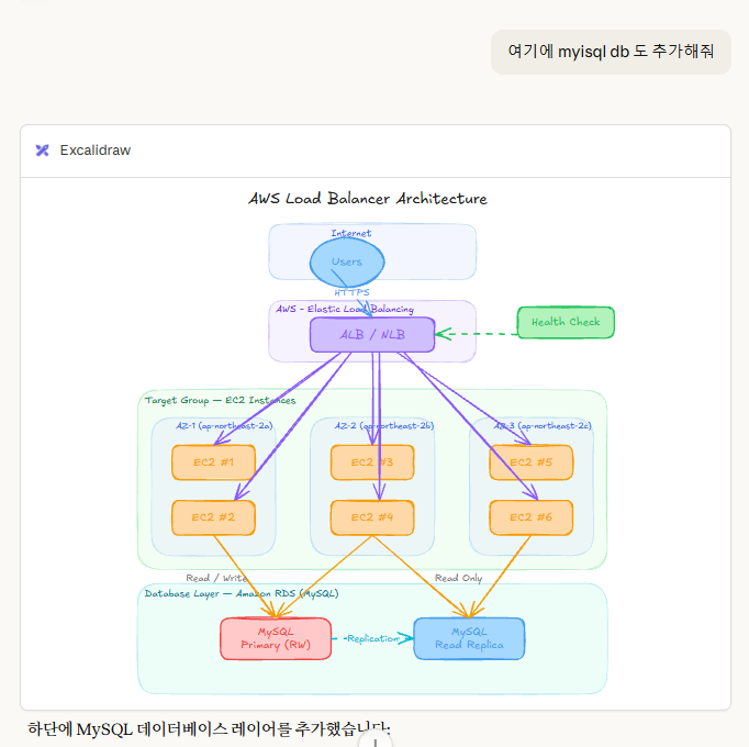 새 대화를 열고 "간단한 아키텍처 다이어그램 그려줘"라고 해보면 된다. 커넥터가 잘 연결됐으면 바로 Excalidraw 다이어그램이 채팅 안에 나타난다.