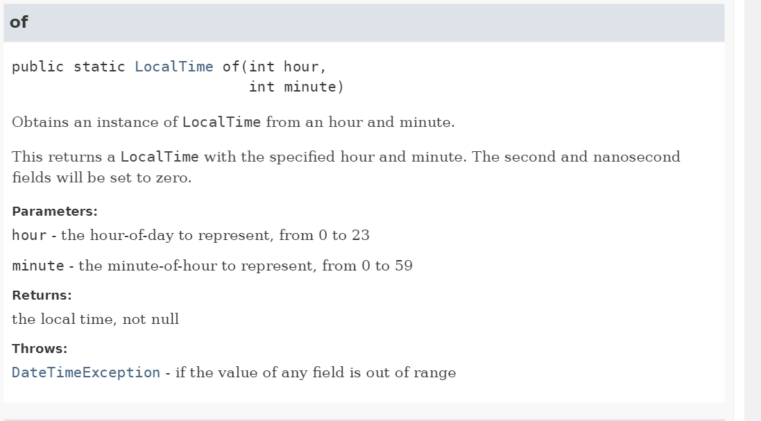 이 말은 Localtime 의 생성자가 private 하다는 것을 의미한다. 공식 문서를 살펴보면 대신 of와 now라는 정적 팩토링 메소드 (Static Factory Method)가 존재하는 것을 알 수 있다.